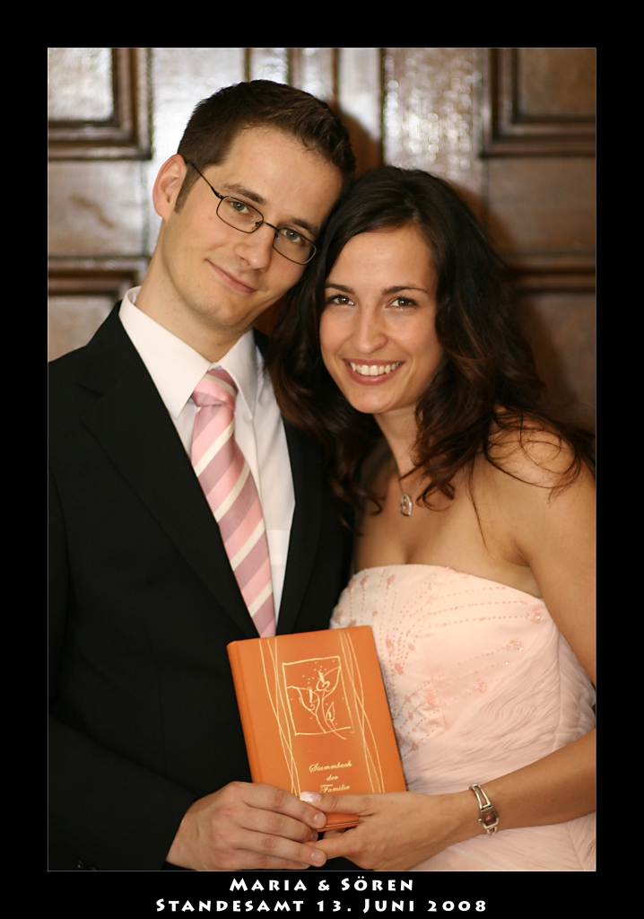 Hochzeit von Maria und Sören Veröffentlicht am 18. Juni 2008 von tnecke Antworten Am Freitag den 13.6.08 haben Maria und Sören standesamtlich geheiratet. Laut Söris eigener Aussage wird er in ca 2Wochen kugelrund und mit fettigem Haar herumlaufen. Wir werden sehen 🙂 Jetzt jedenfalls sind sie ein schönes Paar!